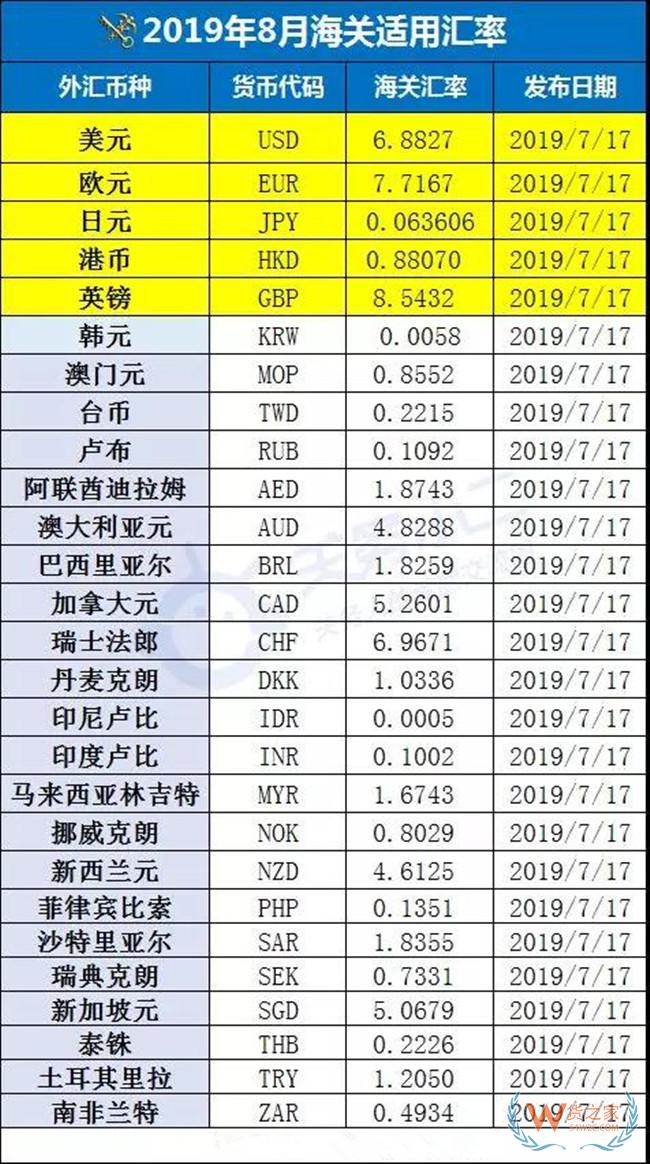 7月17日是2019年7月份的第三周的星期三,8月的海关适用汇率也可以确定了。关务小二整理了8月海关汇率,方便大家进行8月份的贸易成本核算。